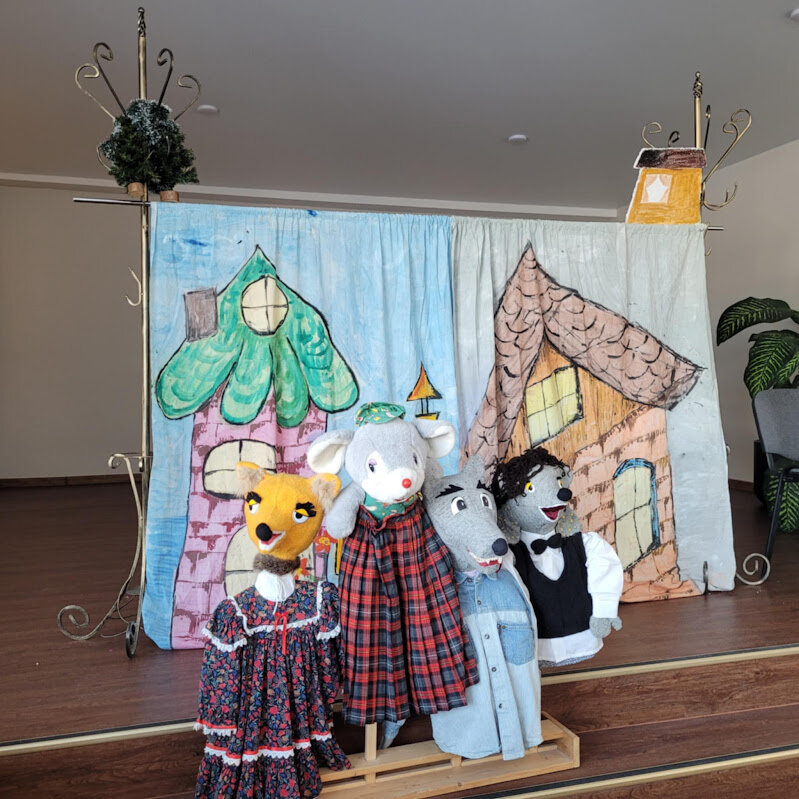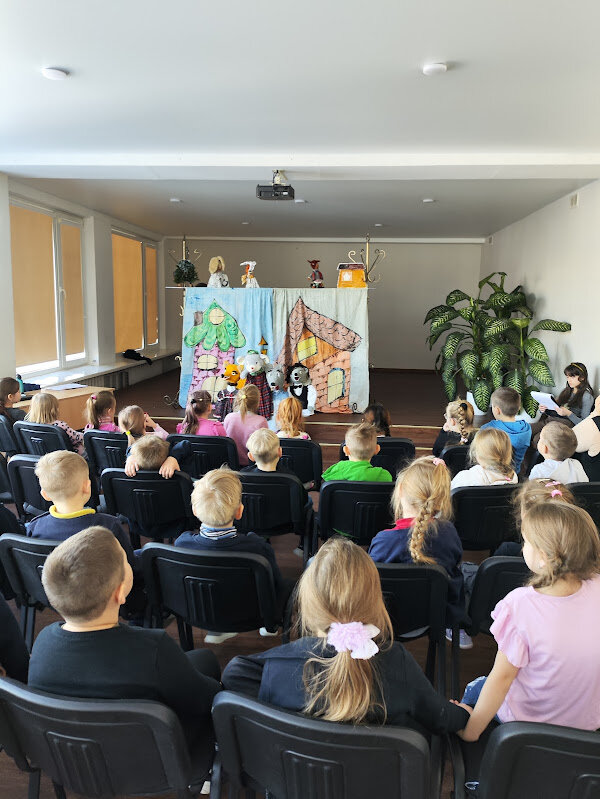 mokiniai su džiaugsmu stebėjo lėlių spektaklį „Kiškio trobelė“, kurį pristatė būrelio „Esu ypatingas, nes...“